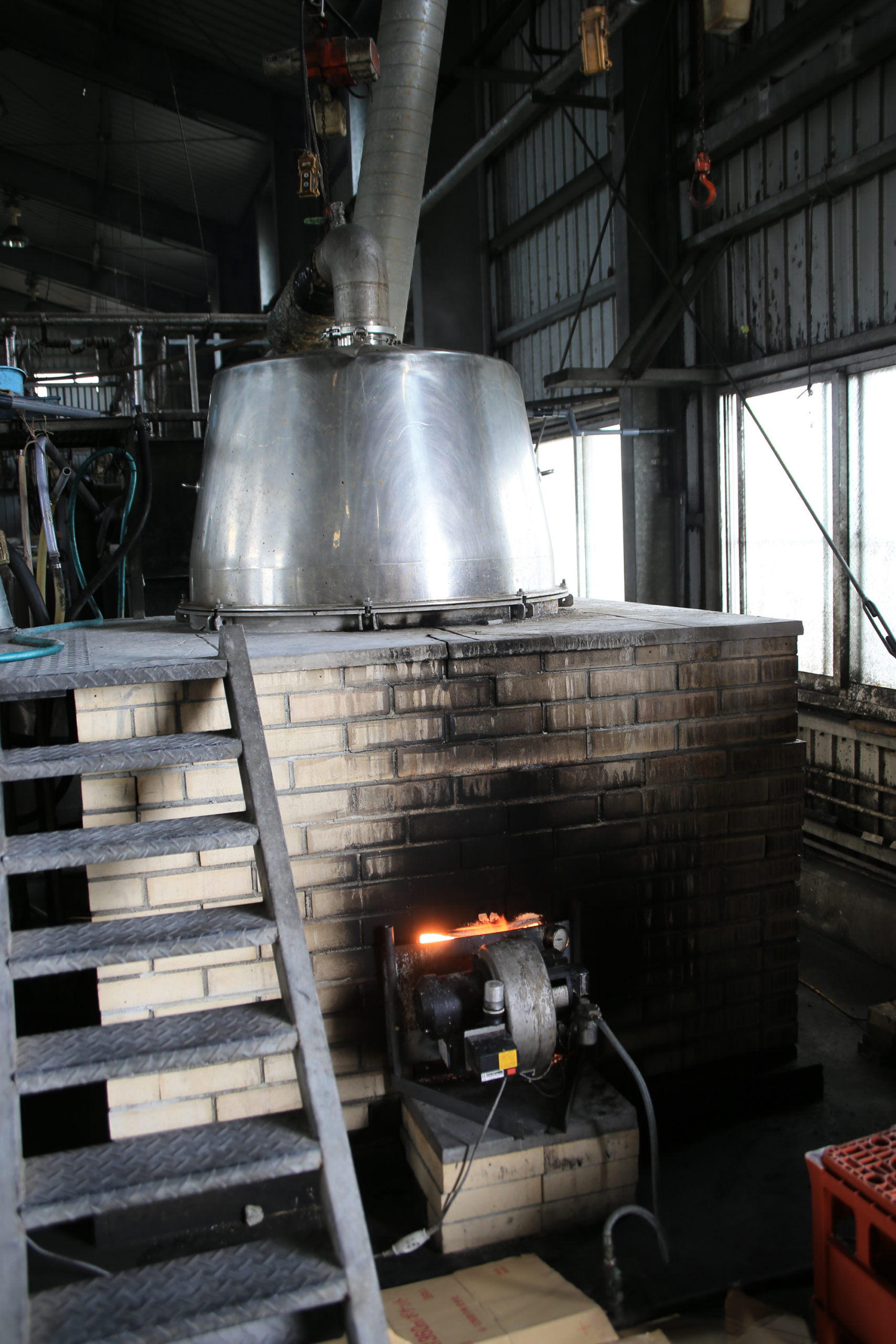 工場に入ると「ゴォォォォッ!!!」フイゴ(鍛冶屋などで燃焼温度を上げるときに空気を送る装置)の音が聞こえてきた。そう言えば、崎元酒造は今なお「地窯蒸留」を行っている数少ない酒造所と聞いていた。これがその地窯蒸留器である。昔話に出てくる「ぶんぶくちゃがま」のそれを熊サイズにしたと言えば分かりやすいか。一般的な蒸留所は蒸気の熱を利用しているが、ここは直火炊きで蒸留するのだ。炊飯器でもそうだが、「直火炊き」というとなぜだか美味しくなるような気がする。