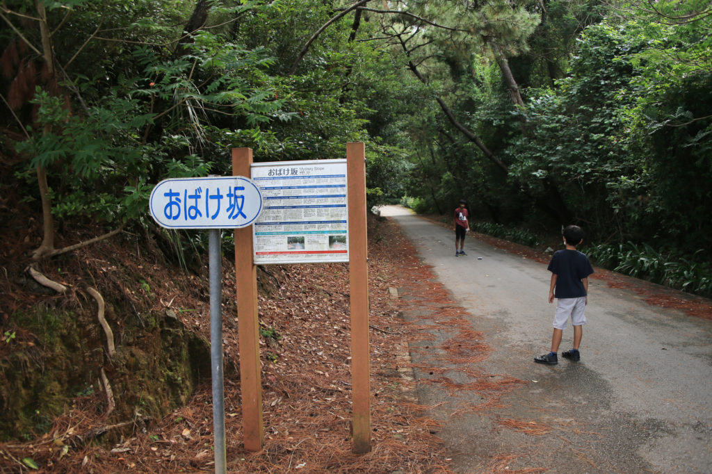 まずはグーグル先生に尋ねるのが21世紀を生きる人類の習わしである。すると近くにあった「おばけ坂」おすすめしてきた。さすが先生、「通」である。 説明を見るとこうだ。「下り坂に見えるのに坂にボールなどを置くと、逆に登っていく」というのだ。これは興味をそそられる。ナビを頼りに道を進んで行くと、ナビあるあるの「次の曲がり角の距離感がわからない」が炸裂である。いかにも古い民家の前でUターンし、ルートを修正。すると木々のトンネルに差し掛かり、そこを抜けると草原と案内板が現れた。いま通ってきたところが