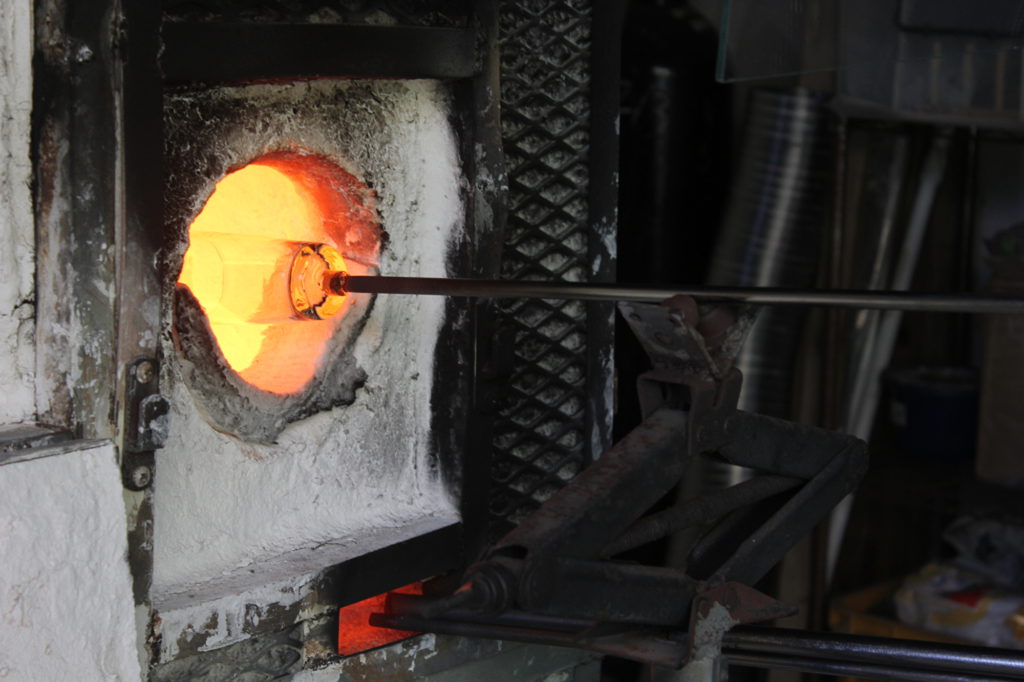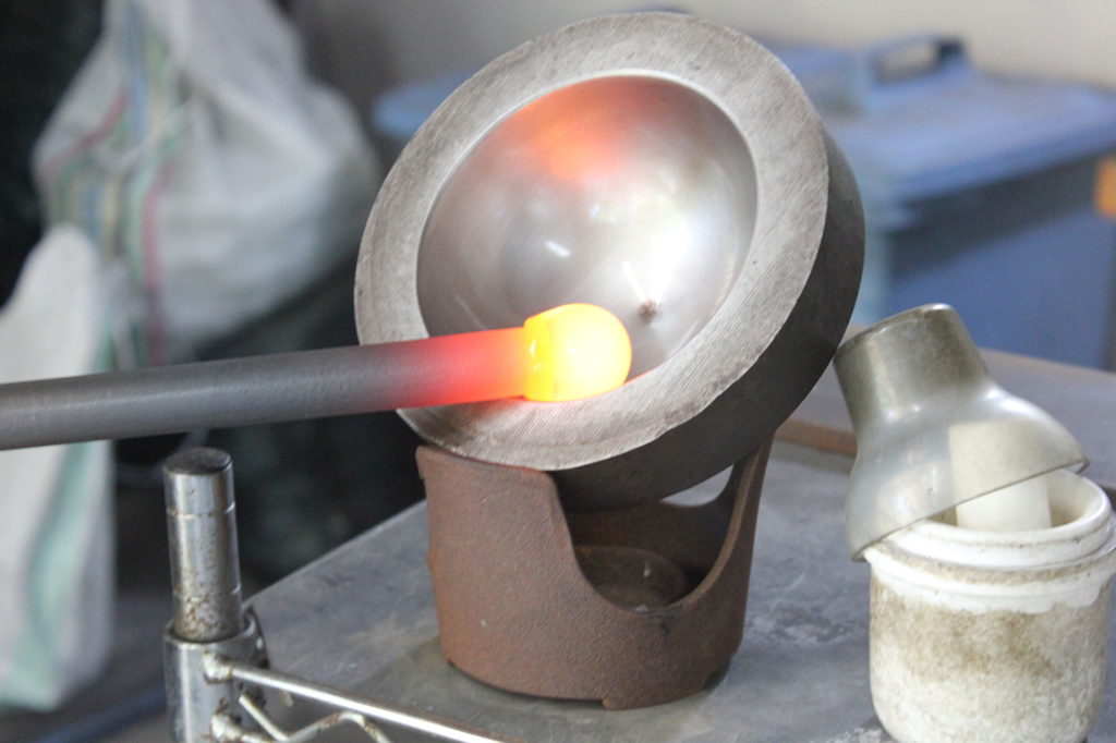 「清天は体験もあるけど、生産がメインなので。技術は、清天で学びました。手元として棒を持って行ったり、棒の先にガラスをちょっと巻いて、形つくって渡す。すると、吹き職人が、ガラスを捕まえて、つけて、落とす。棒をつけたあとは、仕上げの職人に渡すっていう、手元の仕事。そのあとは、下玉と言って、豆電球みたいなガラスを作る作業。吹いて反対側に棒をつけ、切り落とすまでの作業ですね。ここまでで、4年かかかった。途中、後輩に追い抜かれたこともありました」