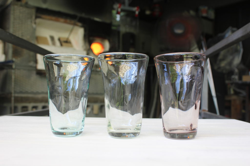 鈴木さんが手掛けるグラスの特徴は、なんといっても再生ガラスを使用していること。再生ガラス特有の透明感と深み、鈴木さんの感性から生まれる、飾らない美しさにファンも多く、催事でも人気だと聞きます。